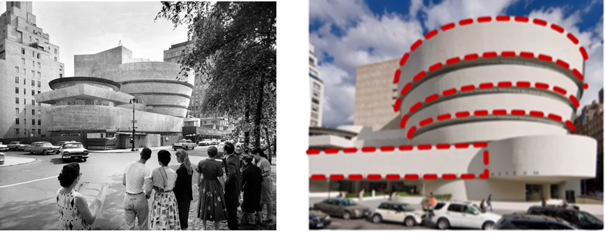 Contrasts with the surrounding buildings with its organic shape while Manhattan city follow grid and geometric forms